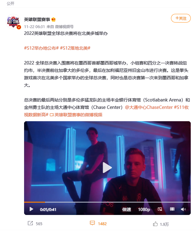 拳头游戏电竞赛事全球总裁John Needham和英雄联盟电竞赛事全球负责人Naz Aletaha等出席了本次发布会,并阐述了拳头游戏2022全球总决赛的“北美掠影”计划,赛事的最后两站将在猛龙队的主场丰业银行竞技场(Scotiabank Arena)和六届NBA总冠军勇士队的主场大通中心(Chase Center)举行。