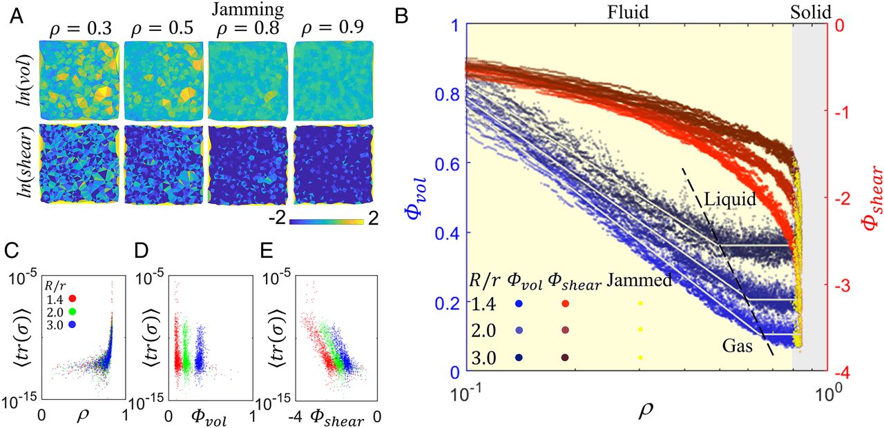 对于图像中的每个三角形,他们测量了两个关键参数:体积秩序,或一个三角形内的空间;以及剪切秩序,或一个三角形的形状离等边有多远。第一个参数表明材料的密度波动,而第二个参数则说明材料有多容易变形。他们发现,这两个参数足以描述一种组织是否更像固体、液体或气体。