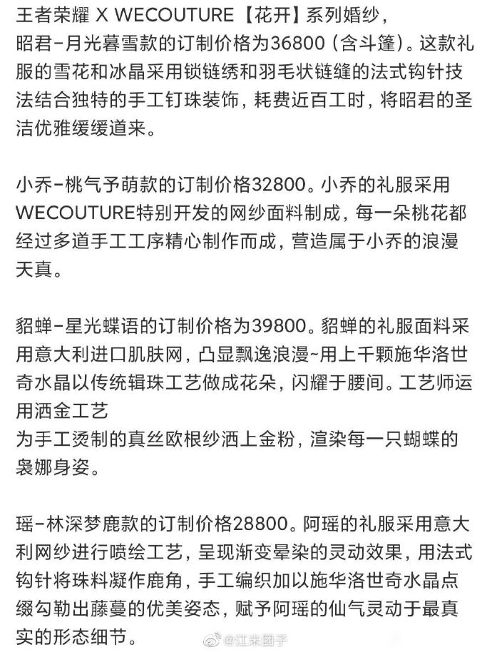 游戏博主@江米团子爆料称,瑶版婚纱定制价格28800元,貂蝉版婚纱定制价格39800元,小乔版婚纱定制价格32800元,昭君版婚纱定制价格36800元。