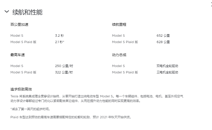 据悉,Model S Plaid搭载三台驱动电机,采用四轮驱动形式,在EPA工况下,续航里程达到628公里,最大功率超过750kW(1020Ps),0-100km/h加速时间仅需2.1秒,0-1/4英里(即0-400米)加速时间小于9秒,最高时速可达322公里/每小时,是全球现阶段最快的量产车。