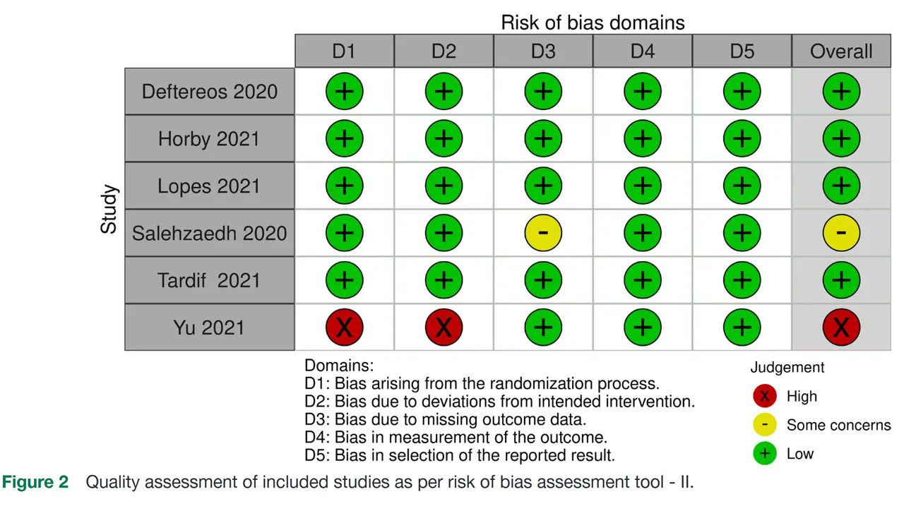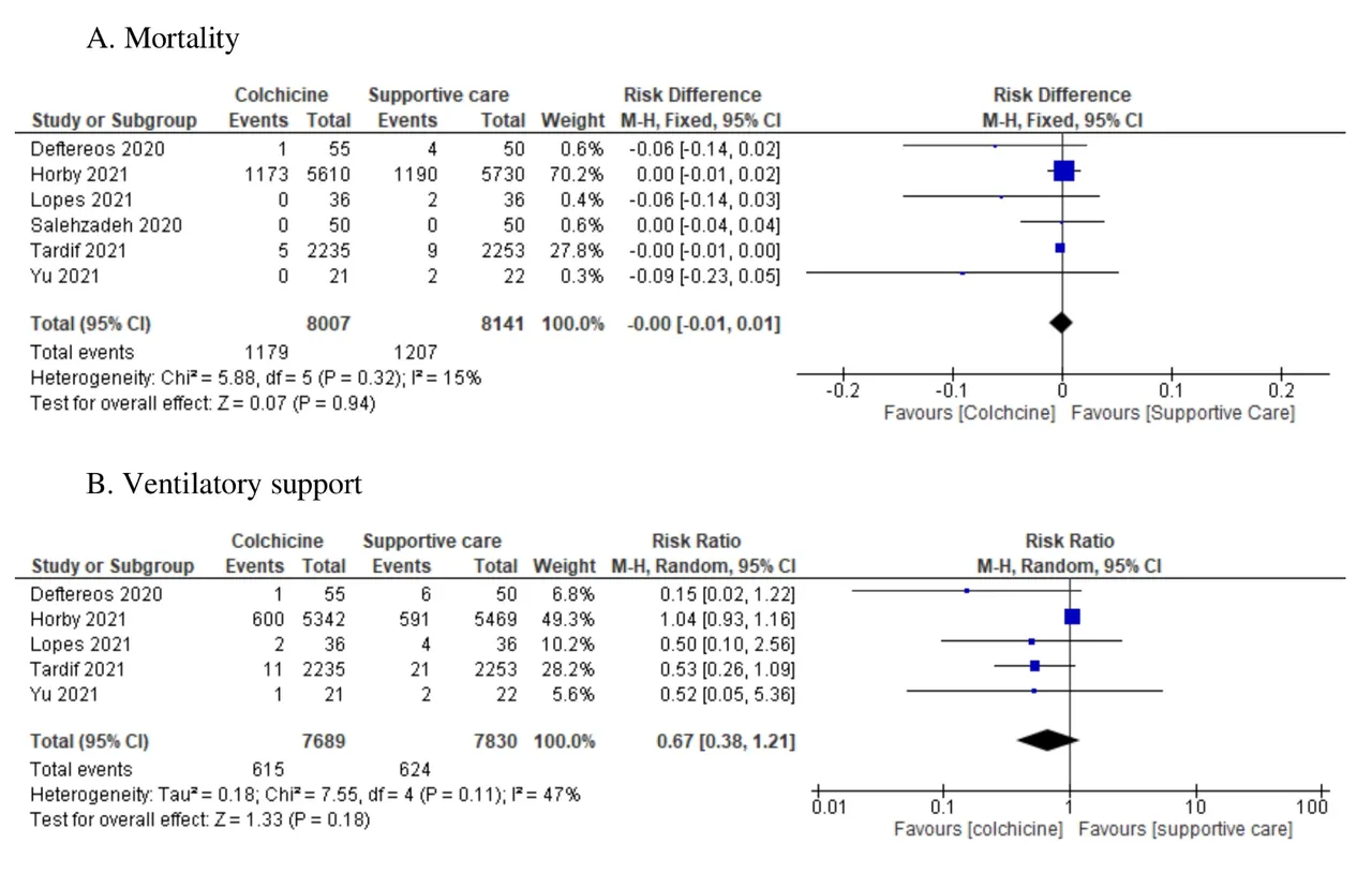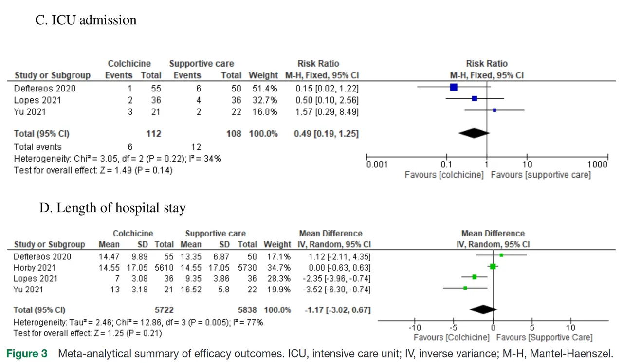 这表明,在接受秋水仙碱治疗的患者和只接受常规支持性护理的患者之间,死亡(6项研究)、需要呼吸支持(5项研究)、进入重症监护室(3项研究)、住院时间(4项研究)或严重副作用(3项研究)的风险没有显著降低。服用秋水仙碱的患者的副作用发生率也比给予支持性护理的患者高58%,腹泻的风险几乎是两倍。