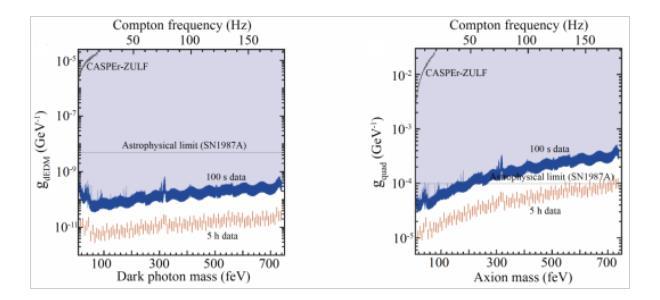 图2:本研究的暗物质搜寻结果:暗光子与原子核的耦合界限(左),轴子与原子核的耦合界限(右)