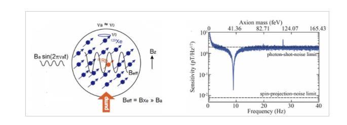 大量的理论预测暗物质与原子核会发生极微弱的相互作用,这种相互作用相当于在原子核自旋上施加一个微小磁场(又称为“赝磁场”)。利用超灵敏磁场探测装置可以检验这一微小的赝磁场,以此来寻找暗物质粒子存在的迹象。