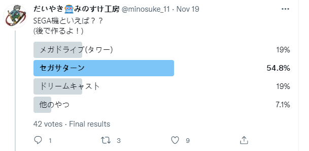 @minosuke_11网友不久前还发起了新作品制作意向网络投票,看看网友们对于世嘉旗下的几款经典主机哪一款更感兴趣。