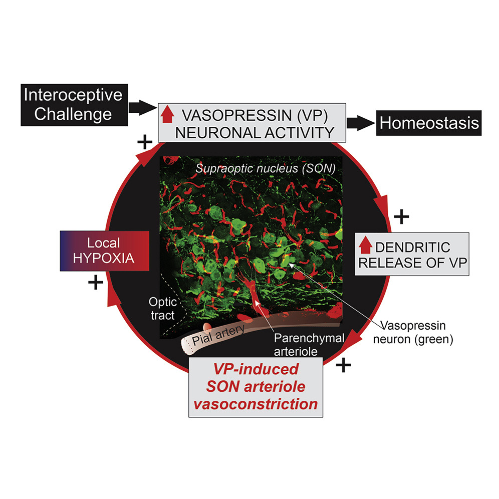 研究小组将该现象称为“逆神经血管耦合”,即血流减缓导致缺氧,同时,他们还观察到其他的差异性,在大脑皮层中,血管对刺激反应非常局部化,血管扩张迅速,在下丘脑中,血管对刺激的反应是扩散化的,而且反应速度慢,会持续很长一段时间。当我们摄入大量盐,体内钠指数会在很长一段时间内保持较高水平,缺氧是一种有效机制,可以增强神经元对持续盐刺激的反应能力,使它们在一段时间内保持活跃。