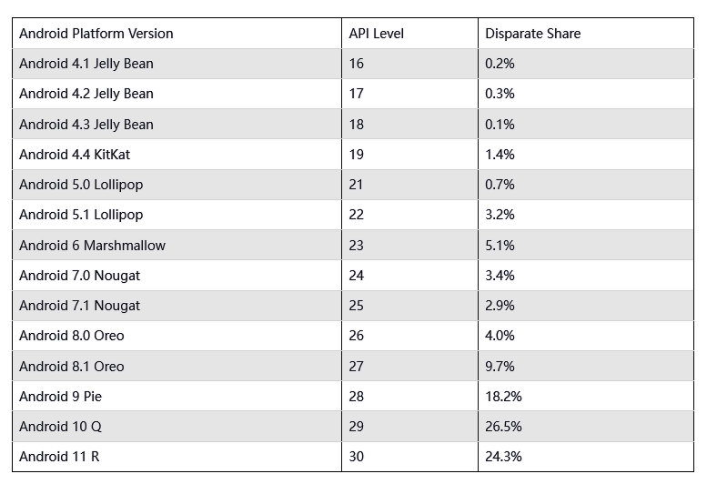 10 月份刚刚发布的 Android 12 还没有记录读数。9to5Google 估计该数据约为 3 周前的数据。Android 版本分布图此前一次公布还要追溯到 2020 年 4 月,再之前则是 2019 年的 5 月和 2018 年的 10 月。