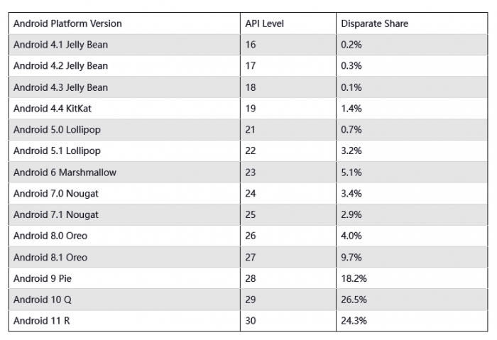自 2018 年以来,Google 一直对公布 Android 版本分布非常谨慎。不过今天,Google 决定公布新的数字。发表在 Android Studio 上的报告显示,在发布 14 个月之后,Android 11 的份额已经达到了 24.3%;Android 10 的份额最大,为 26.5%。Android 9 以 18.2% 位居第三。