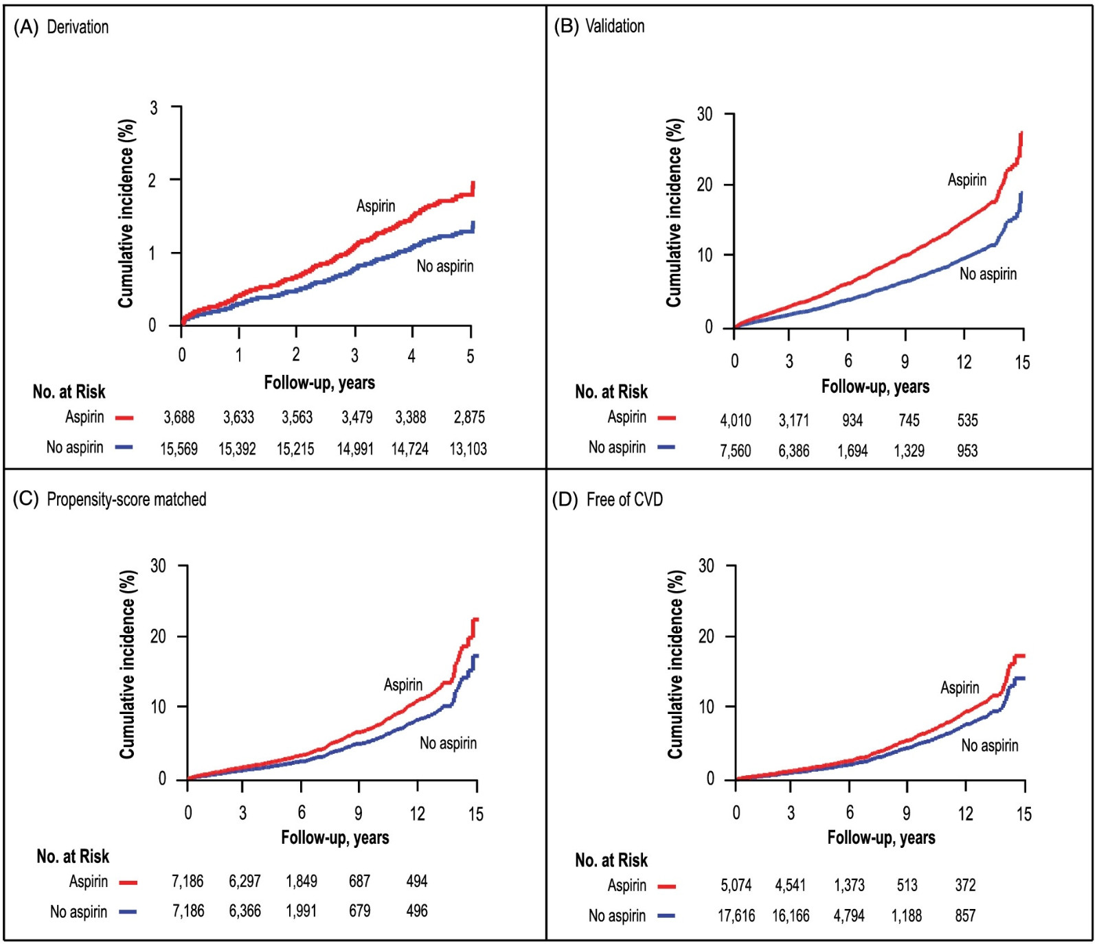 为了检验结果是否呈现一致性,研究人员还在匹配了阿司匹林服用者 / 非服用者的心力衰竭风险因素后、进一步排除了有心血管疾病病史的患者,并重复开展了一番分析。
