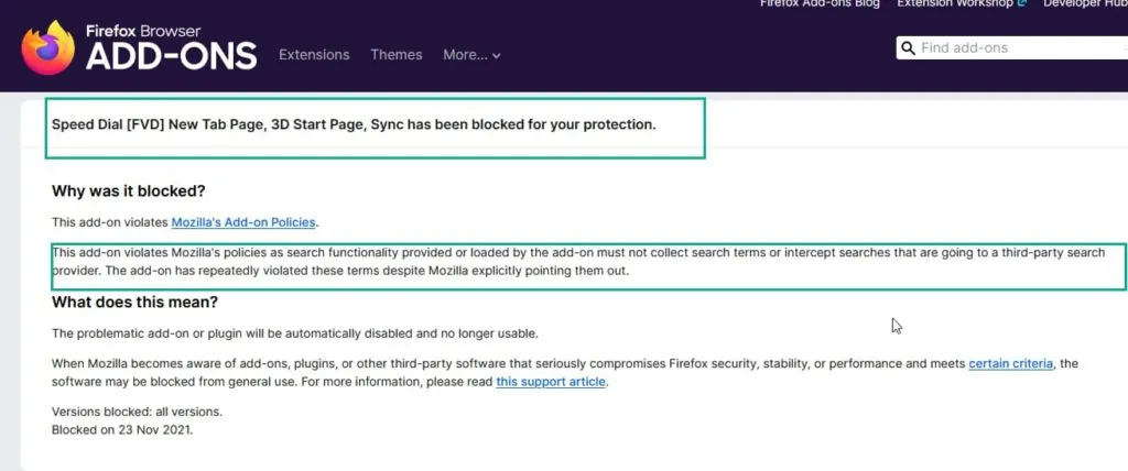 因称违反附加组件政策,Mozilla 已经从 AMO 中删除了 FVD Speed Dial 扩展程序。如果你正在使用该扩展程序,那么现在 Firefox 可能已经帮你禁用,而且也无法常规下载安装。