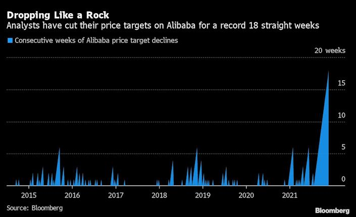 由于多家机构出于竞争原因下调阿里巴巴目标股价,华尔街给出的阿里巴巴平均目标股价连续第18周下跌。本周至少4家机构下调了阿里巴巴目标股价。投资公司Susquehanna将阿里巴巴目标股价由310美元下调逾三分之一至200美元。