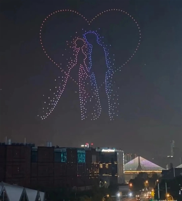 近日,长沙夜空出现数百架无人机,组合成各式浪漫图案,这画面让不少女网友直呼浪漫。据了解,系一男子向女友求婚所设计,共600多架。摄影人员表示,无人机以及审批程序都是男主自己负责的。