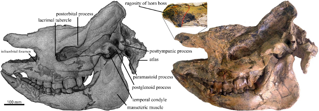 山东山旺盆地发现的并角犀头骨化石 (中科院古脊椎所供图)