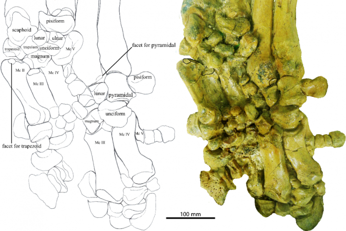 山东山旺盆地发现的并角犀脚骨化石 (中科院古脊椎所供图)