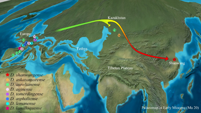 晚渐新世到早中新世并角犀属在欧亚大陆的分布和可能的迁移路线。(中科院古脊椎所供图)