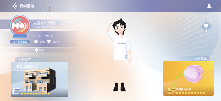 从个人页面退出来后,“宇宙搜索”通向一张模拟人生风格的地图,地图上有两处被标记的地点,但都不能进入。简单来说,这更像一个静态页面,不过从这里可以回家——虹宇宙分了我一套房子,一个数字房产,名字是花园洋房户型A。进去是一个开间,两扇落地窗,除了窗外有一个花园以外,家徒四壁。