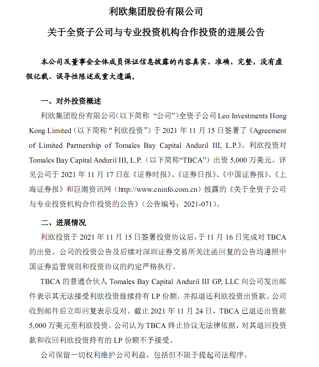 利欧股份立即回复表示反对,但在11月24日,TBCA退还了利欧投资的出资款5000万美元。