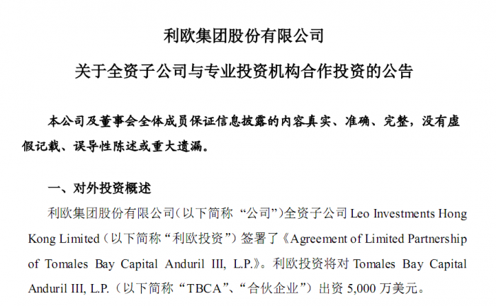 SpaceX无疑是当下最热门的航天科技企业,在投资市场上也是炙手可热,但是近日,一家中国公司对SpaceX的投资,却被直接退了回来。11月17日,利欧集团股份有限公司公告称,通过旗下全资子公司Leo Investments Hong Kong Limited(以下简称利欧投资)与Tomales Bay Capital Anduril III, L.P.(以下简称TBCA)签署投资协议,出资5000万美元(约合人民币3.2亿元)。