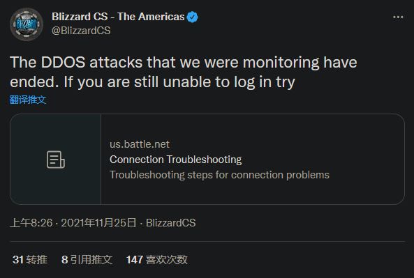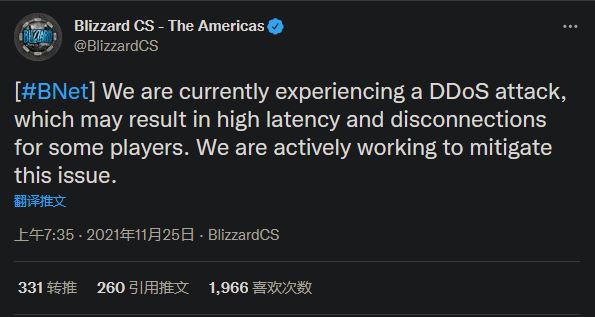 暴雪于今天(11 月 25日)早晨表示旗下战网服务正遭到 DDoS 攻击。在推特上,官方说此次攻击会导致玩家遇到高延迟或是断线,并表示正在尽全力努力缓解问题。宣布遭受攻击 1 小时后,官方发推称正在试图缓解的 DDoS 攻击已经结束,玩家应该可以再次正常登录战网。