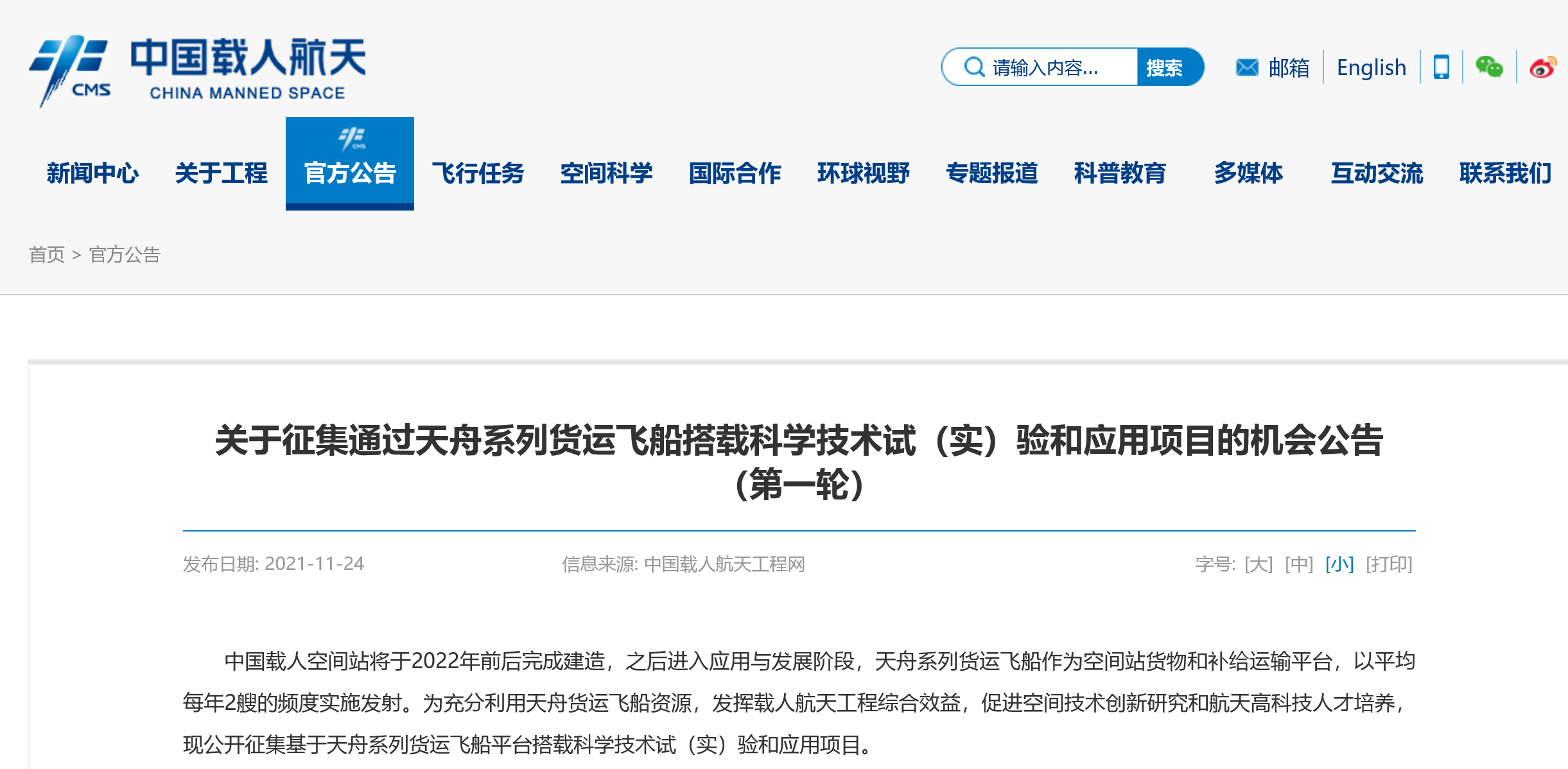 中国载人航天工程办公室近日发布《关于征集通过天舟系列货运飞船搭载科学技术试(实)验和应用项目的机会公告》,面向社会公开征集搭载项目。《公告》全文及条件要求、申报表等,可登录中国载人航天工程网(http://www.cmse.gov.cn)进行查询。
