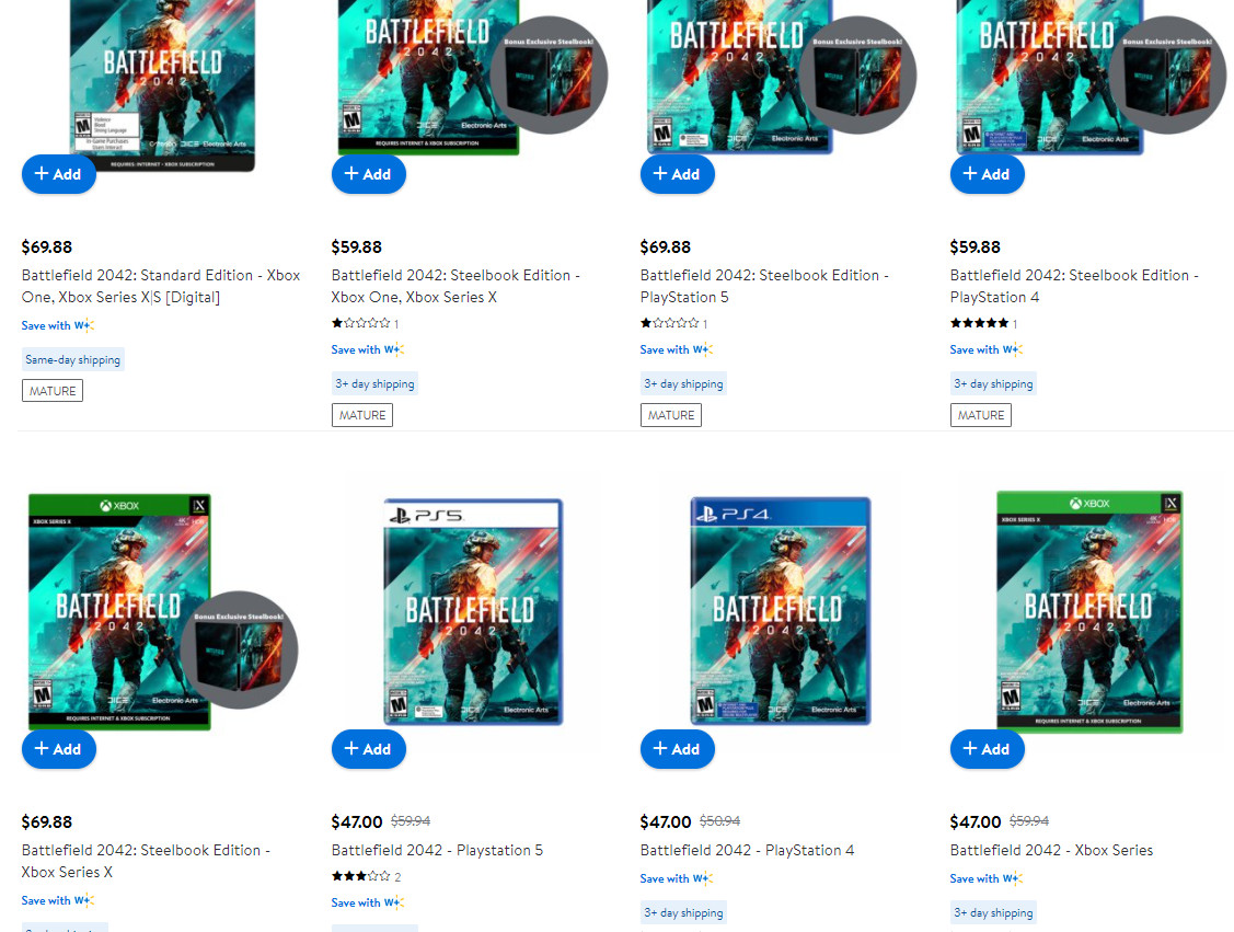 《战地2042》正式发售才一个星期,但这款游戏已经上了国外商店沃尔玛的黑色星期五促销活动中。PS5,PS4,Xbox One和Xbox Series实体版当前售价47美元。这也是第三方商店首次打折促销《战地2042》。
