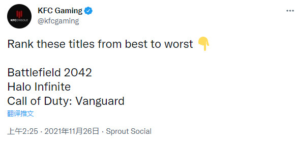 对于今年的三大FPS,肯德基有自己的看法,从最好到最烂依次是《战地2042》、《光环:无限》和《使命召唤18:先锋》。