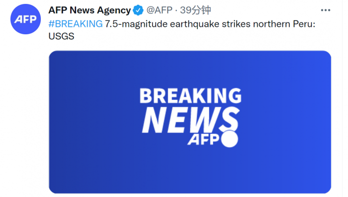 法新社刚刚消息,据美国地质调查局地震信息网消息,秘鲁北部当地时间28日发生7.5级地震,但没有发布海啸预警。美国地质调查局地震信息网称,地震发生在凌晨5时52分,(格林尼治时间10时52分),震源深度112.5公里,位于秘鲁巴兰卡西北约42公里处。