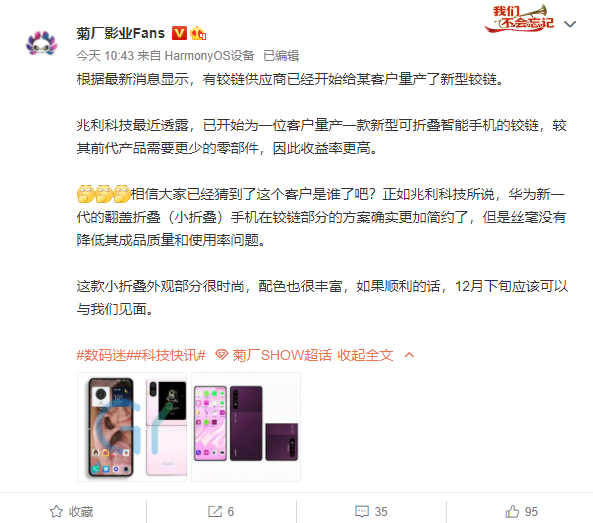 11月29日消息,此前有爆料称,华为将推出一款定位偏女性市场的高端折叠屏新机,将采用上下翻折方案,类似三星Galaxy Z Flip3。今日,据数码博主@菊厂影业Fans 爆料,铰链供应商兆利科技已经开始为华为折叠屏新机量产新型铰链,较其前代产品需要更少的零部件,收益率更高。