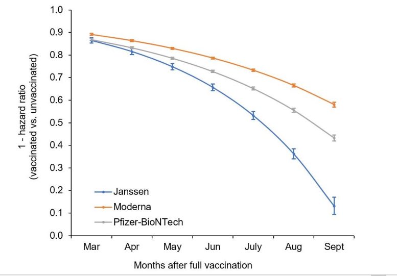 研究人员发现,所有疫苗类型对任何COVID-19感染的保护都在下降,总体疫苗保护从2月的87.9%下降到2021年10月的48.1%。