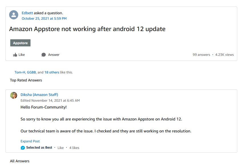 在发现这个问题之后,立即有不少用户在亚马逊官方社区进行了反馈。虽然他们很快就得到了亚马逊工作人员的承认,但在随后的几周里,几乎没有什么活动。从最初的帖子到现在,已经过去了近五个星期。虽然有更多的用户报告说遇到了这个问题,但已经发布的唯一回应是“我们的技术团队仍在调查这个问题”。