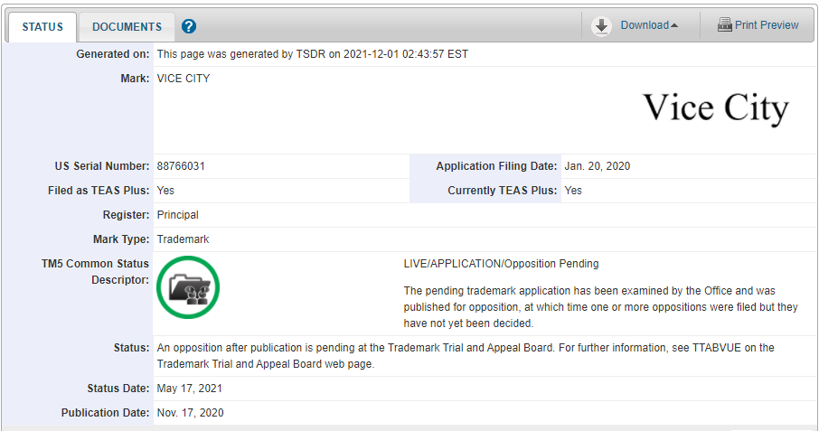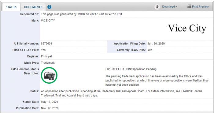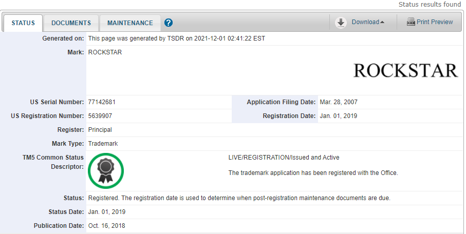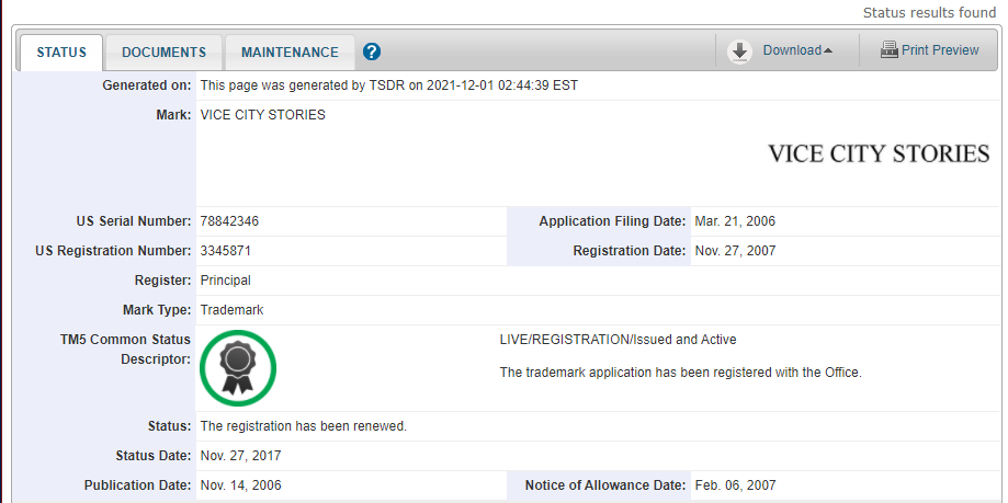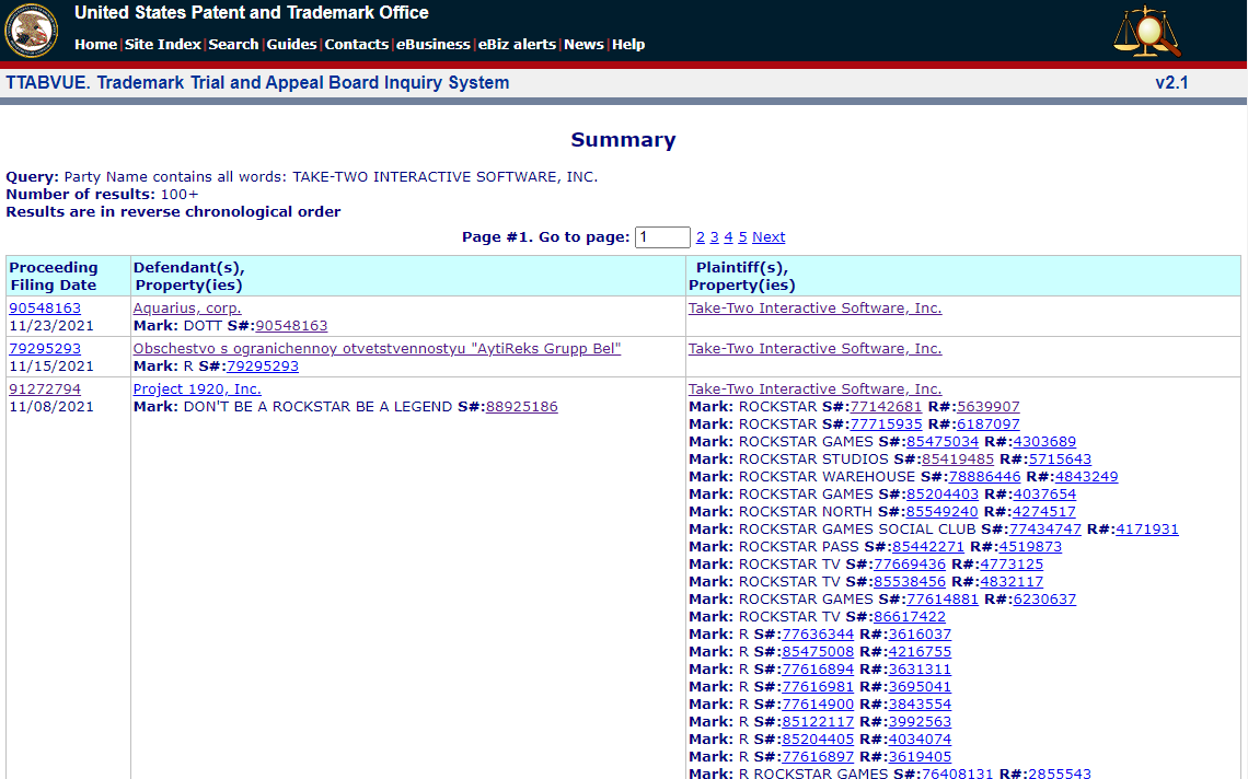 进入美国专利商标局的官网发现,Take Two一直在疯狂的打官司。而每次起诉的原因都是因为对方公司的产品中使用了Take Two旗下产品名字中的单词。这些公司只要使用了这些单词,无论字体、颜色、大小,都被Take Two一一起诉。