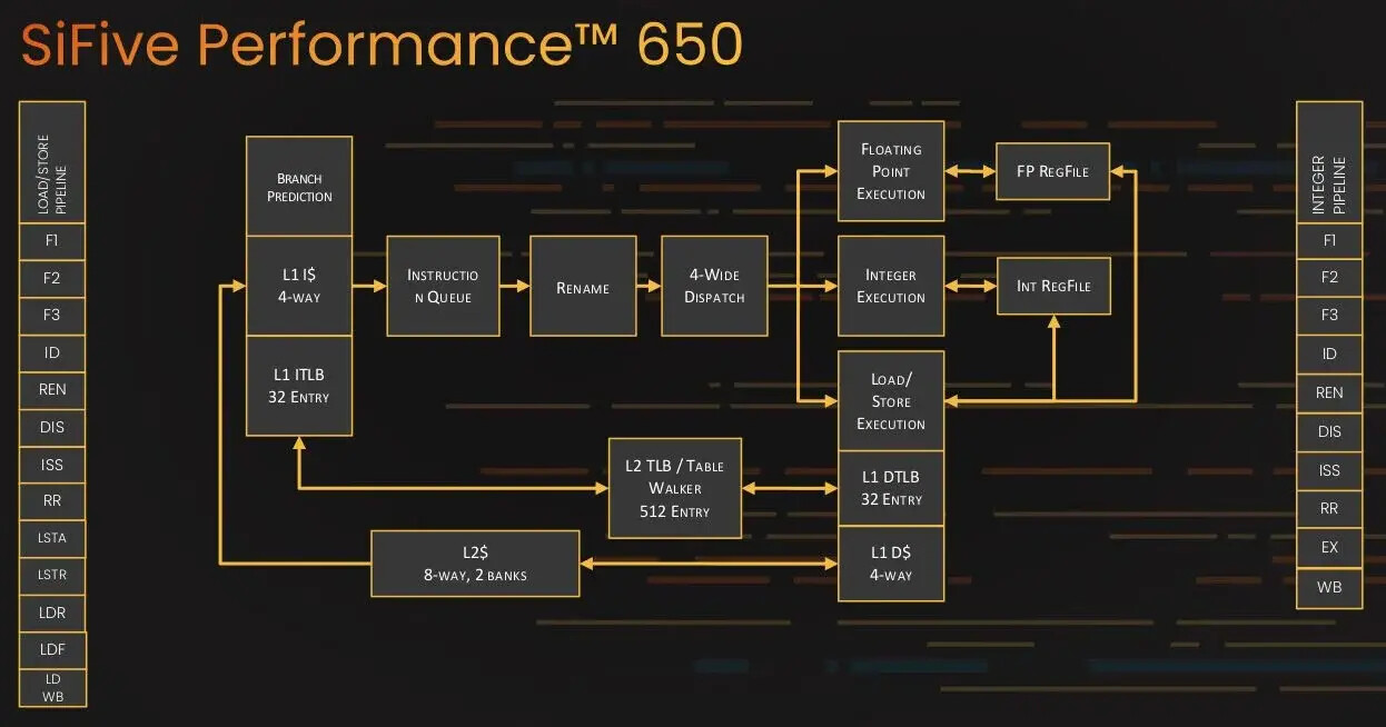 在保持高效率核心流水线的同时,P650 还扩展了处理器指令的发布宽度,为每周期时钟带来了让人印象深刻的 40% 性能提升。