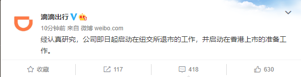 12月3日消息,@滴滴出行 官微宣布,经认真研究,公司即日起启动在纽交所退市的工作,并启动在香港上市的准备工作。 在此之前,滴滴出行曾先后表示,“滴滴将数据权让渡第三方、引入大股东以及退市”“公司管理层变动”等市场传闻均为不实信息。