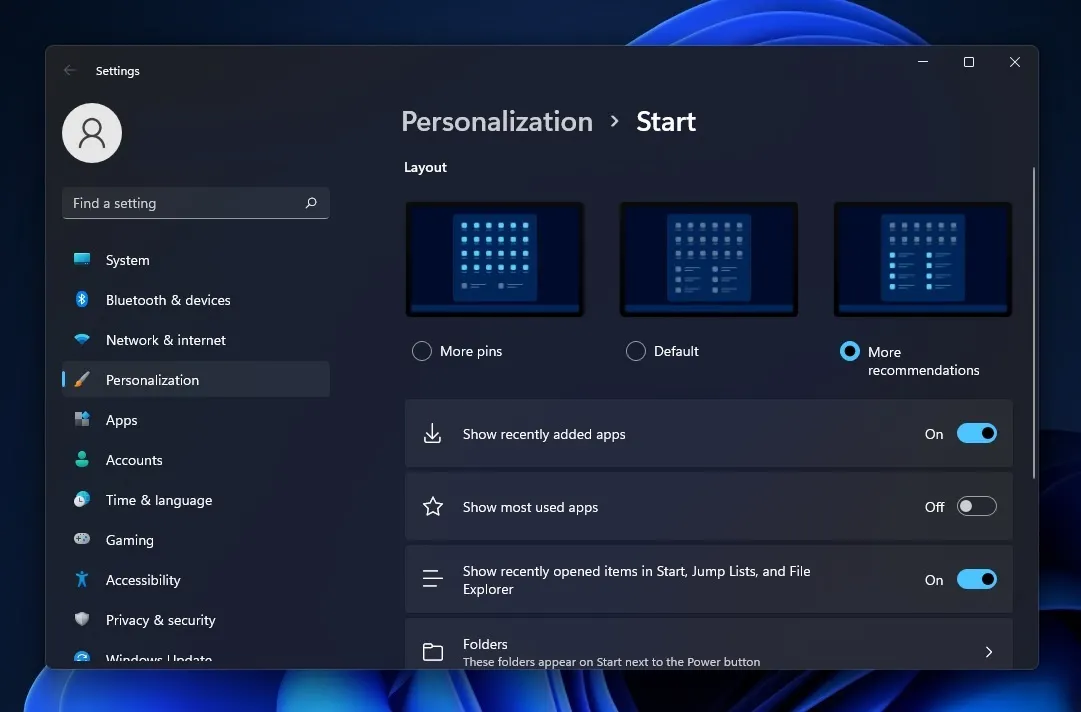 如果你喜欢推荐而不是固定的应用程序,只需选择第三个选项,就可以有更多推荐。如果你编辑了很多文件,并希望在开始菜单上看到这些活动,这可能很有帮助。
