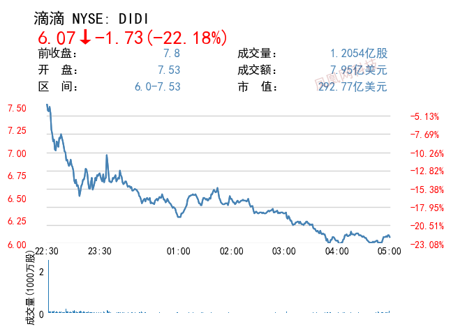 昨天宣布从纽约股票交易所退市、寻求在香港股票交易所上市后,今天常规交易中滴滴股价下跌1.73美元,跌幅为22.18%,报收于6.07美元,盘中一度探底6美元,跌幅达到23%。自上市以来,滴滴股价总体呈下跌趋势,与当初的上市价相比,当前股价跌了约一半。