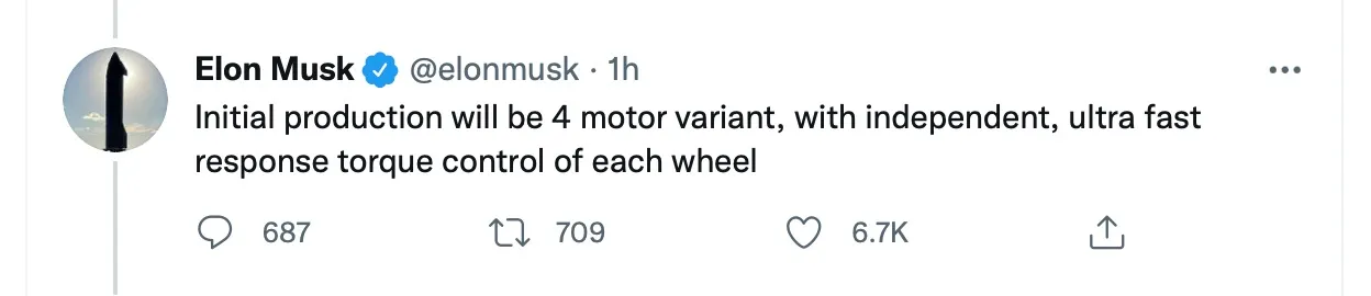 在 2019 年发布之后,电动皮卡车市场不断有挑战者加入。Rivian 公司的 R1T 已经开始交付给预购客户,配有 4 个电动马达。GMC 的悍马电动车即将发布,同样每个车轮都有一个电机。现在,马斯克已经证实,Cybertruck 正在提高它的游戏水平,以便更好地竞争。
