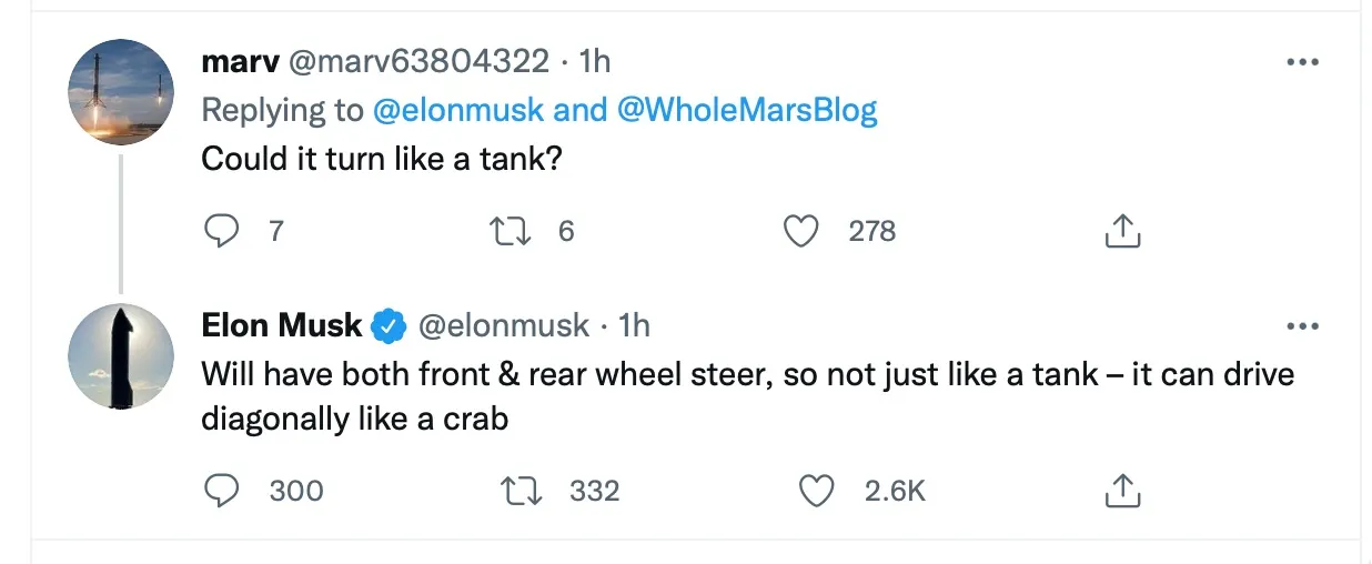 马斯克在推文中表示,将增加一个四电机的变体。他补充说,这将允许“每个车轮的独立、超快速响应的扭矩控制”。马斯克补充说,网络卡车还将有前后轮转向系统。这样“它可以像螃蟹一样斜向行驶”。