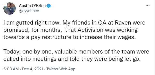 Raven社区经理 AustinO'Brien表示:“我现在很伤心。几个月来,我在Raven的QA朋友得到承诺“动视正在努力进行薪酬重组以增加他们的工资”,现在,QA团队中的重要成员被一个接一个地被叫去开会会并被告知自己将被解雇。”
