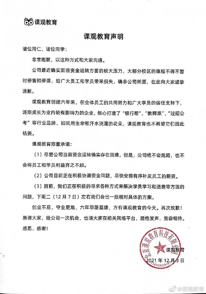 对此,课观教育在微博发布声明称,公司最近确实面临资金运转方面的较大压力,大部分校区的课程不得不暂时停售和停课,给广大员工和学员带来损失。