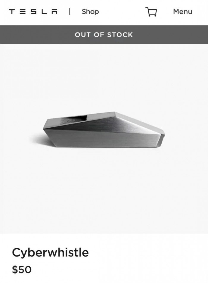 特斯拉商城同时上线一款设计灵感来自CyberTruck皮卡造型的哨子,售价50美元(约合318元人民币)。按照其官方说法,此哨子被名为Cyberwhistle,是一款优质的收藏品,由经过抛光处理的医用级不锈钢制成。