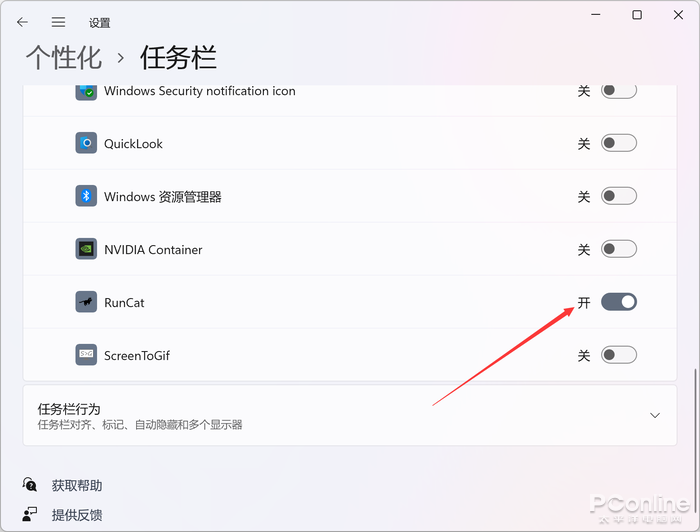 安装了.NET 5.0后,就可以运行RunCat了。注意,如果你用的是Win11系统,想要在任务栏一直看到猫,那么还需要在系统设置中,将RunCat图标设为任务栏常驻。