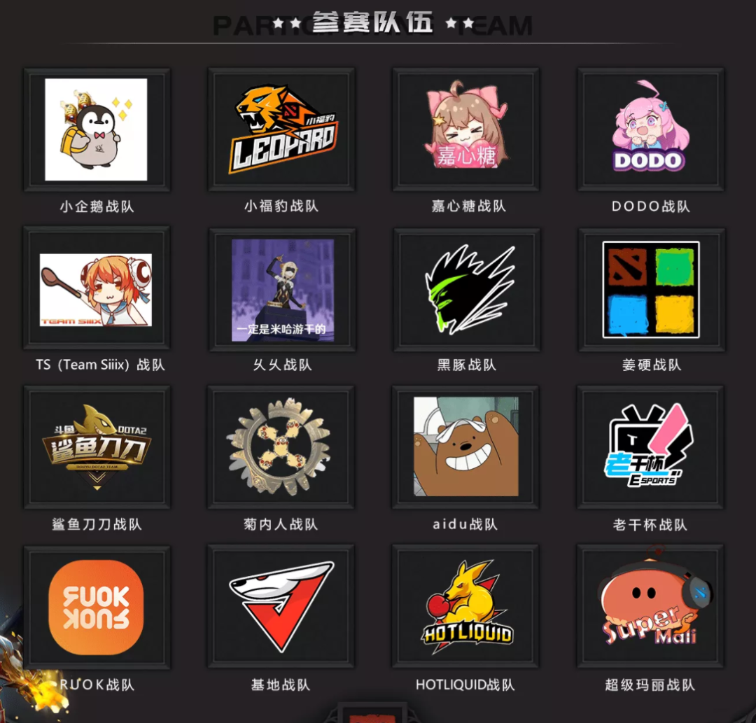 参赛战队名称和战队图标都是梗,我寻思没个几年网上冲浪经历应该没几个人能全对应上,不过认出几个应该不是啥大问题。