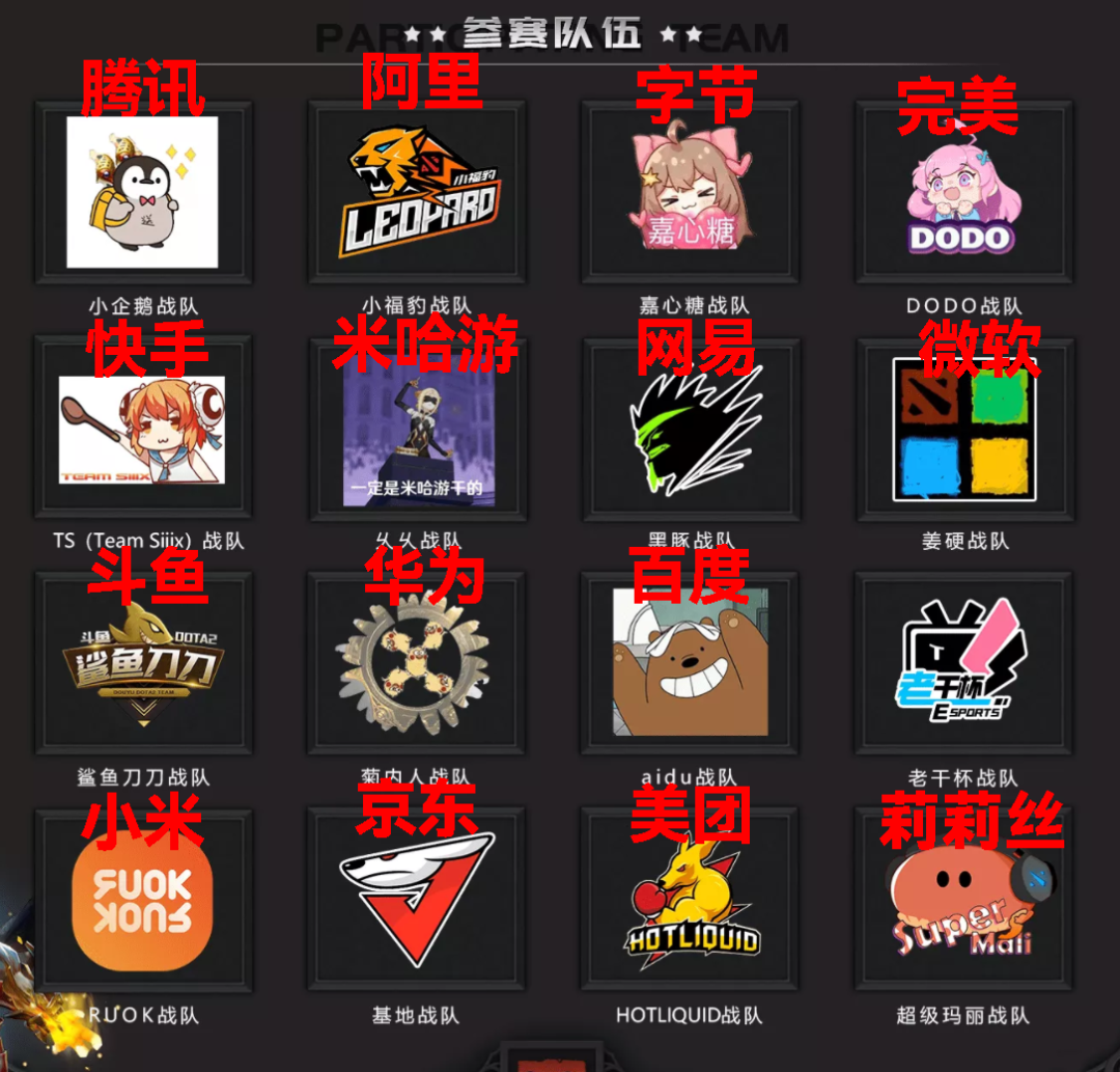 随便哪个都是鼎鼎大名,说这是中国互联网公司的半壁江山都来了,应该不过分吧?这些互联网企业也是一个比一个内卷,参赛名单确定之后两天内,各个队伍就把自己的队标、战旗啥的都设计好了,甚至连入场动画都有。