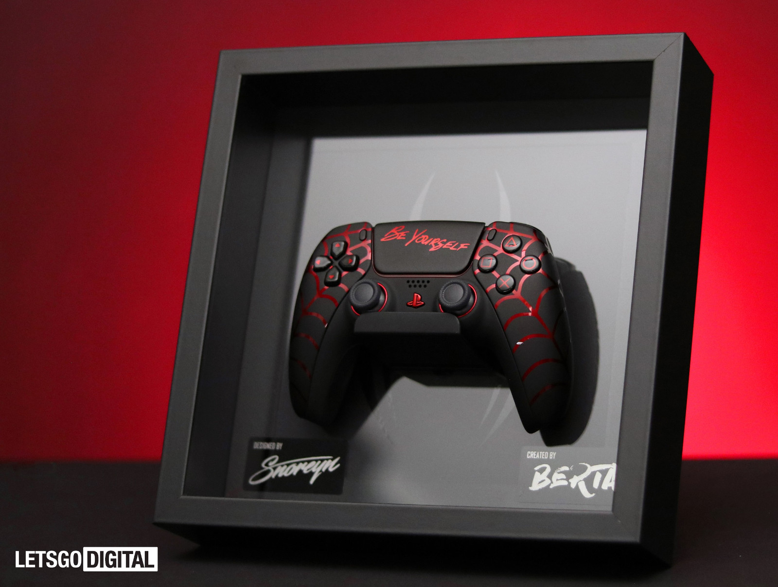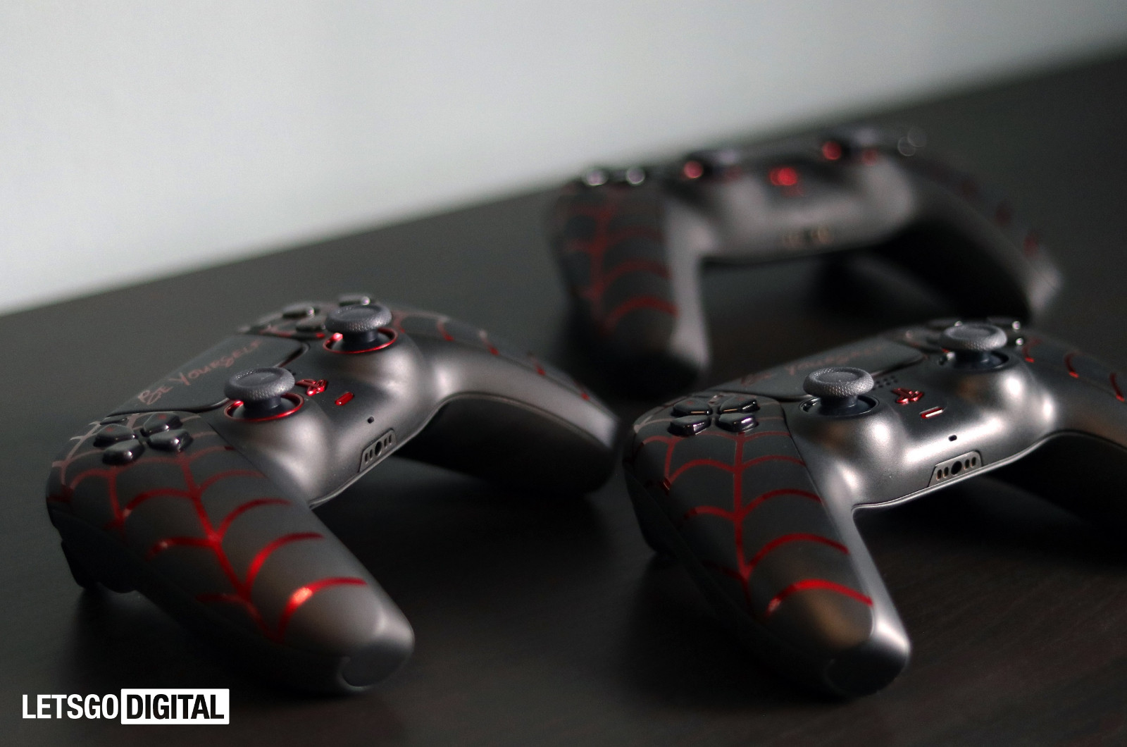 在黑色主体的手柄触摸板上,设计师还打上了“做你自己”(Be Yourself)的标语。此外红黑配色元素被运用到了按钮和周边区域,这些都为 DualSense 注入了更多的个性化元素。