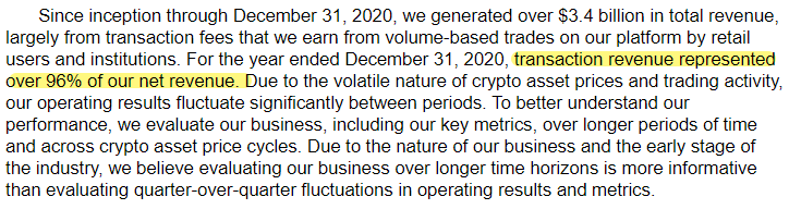 就拿在美国上市的虚拟币交易所 Coinbase 为例,他们在去年的净收入就有 3 亿多美元,总收入中有 96% 都来自交易手续费。