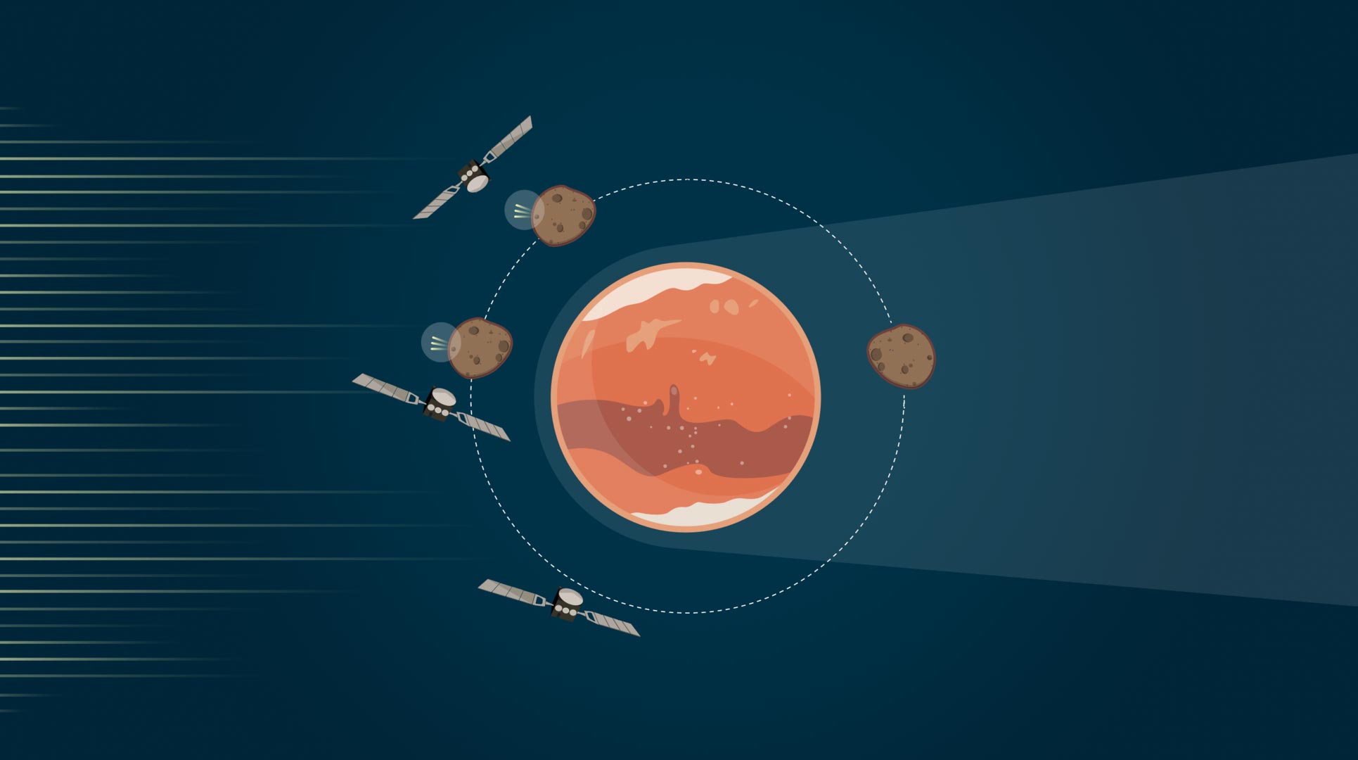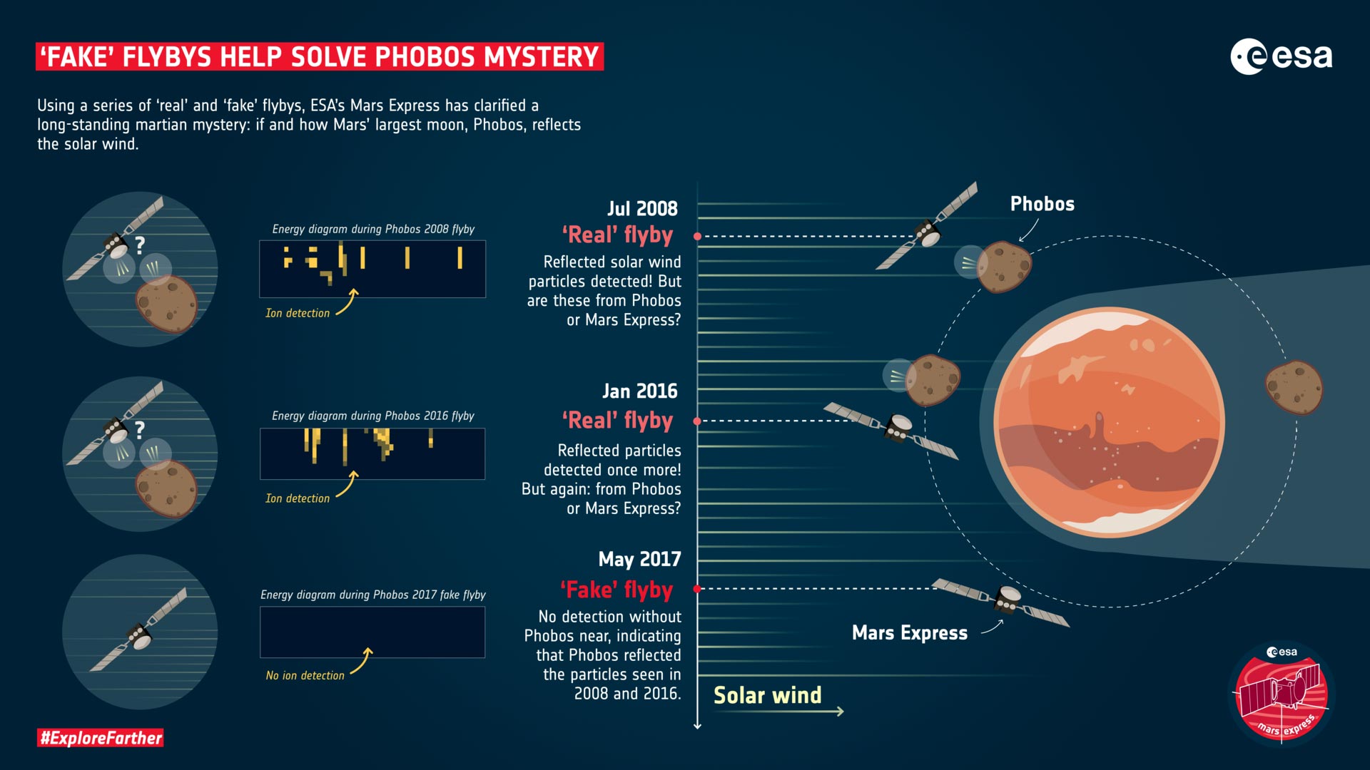 为了探索这种可能性,研究人员在2017年用航天器进行了三次史无前例的特殊操作,被称为“假”飞越。通过使用完全相同的操作序列、控制演习和太阳能阵列调整,Mars Express在充满太阳风的空间中飞行,但没有火卫一的存在,本质上是在进行飞越--只是没有目标。