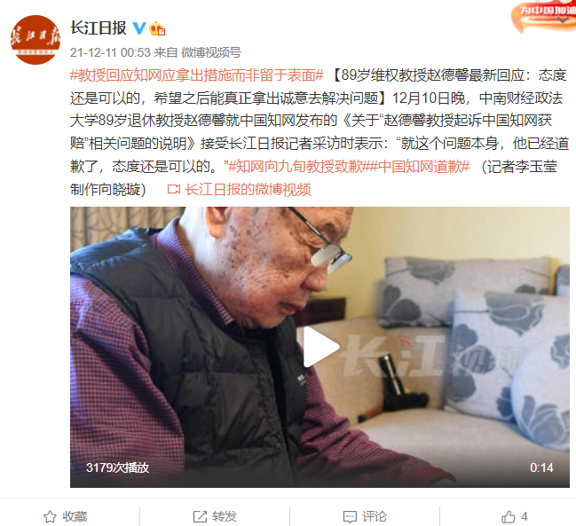 据@长江日报 报道,中南财经政法大学89岁退休教授赵德馨就中国知网发布的《关于“赵德馨教授起诉中国知网获赔”相关问题的说明》接受采访时表示:“就这个问题本身,他已经道歉了,态度还是可以的。”
