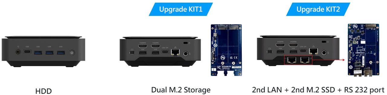 技嘉将提供 BRIX Extreme 的低调机箱,以及一个稍大的机箱,可以容纳一个 2.5 英寸 SATA 驱动器,或一个可选的扩展模块。扩展模块可以增加一对M.2 NVMe插槽,尽管它们将被限制在PCIe 3.0 x1或SATA,或者有一个模块有一个单一的M.2 NVMe插槽,有同样的限制,加上一个额外的以太网接口,以及一个通过RJ45端口的RS-232接口。