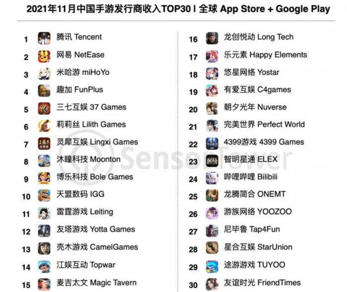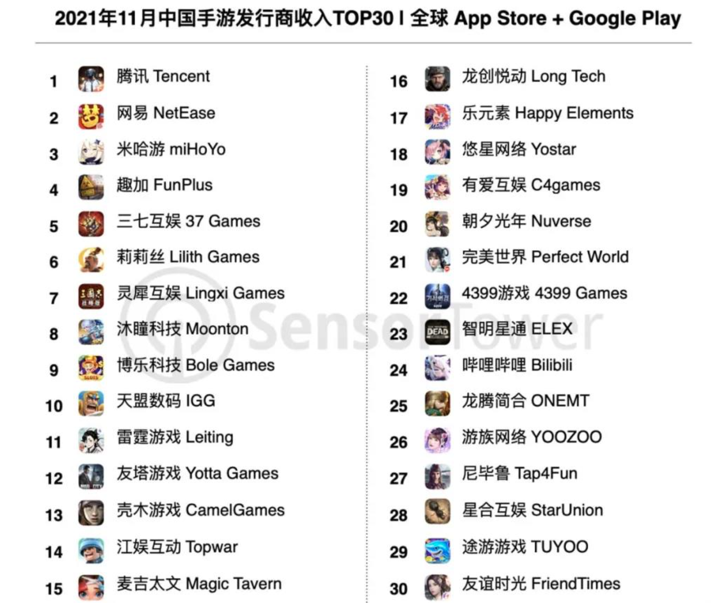 Sensor Tower商店情报平台显示,2021年11月中国手游发行商在全球 App Store 和 Google Play 的收入排名。这一次共37个中国厂商入围全球手游发行商收入榜TOP100,合计吸金超过22.3亿美元,占全球TOP100手游发行商收入的38.3%。
