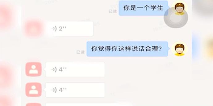 据九派新闻此前报道,近日,安徽一女大学生辱骂外卖员一事引发关注,该学生填错了电话号码导致外卖员联系不到她,于是外卖员留言“没联系上你我没敢放那里,你可以点二次配送”,该学生看到消息后直接发语音破口大骂,“你现在在这打工你就是我儿子一样”“出来打工就给我唯唯诺诺的”“你有本事骂我呀,我直接上诉到你全家遭殃”。