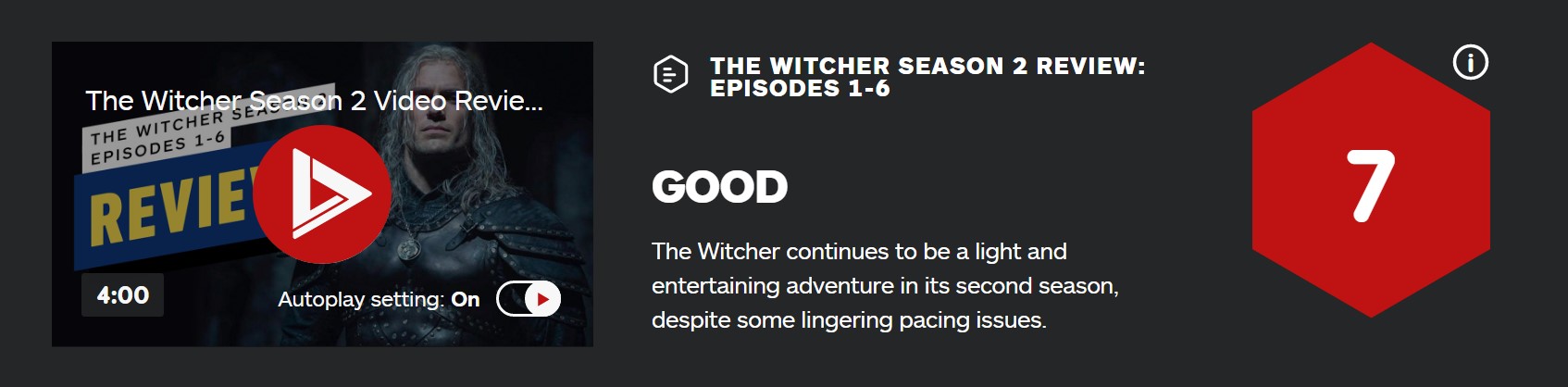 《巫师》真人剧第二季IGN评分现已出炉,IGN给《巫师》剧集第二季打出了7分的评分,表示本作依然是一部轻松有趣的冒险片,但仍有一些节奏问题。《巫师》第二季将于12月17日正式开播,第三季将于2022年第一季度进入制作阶段。
